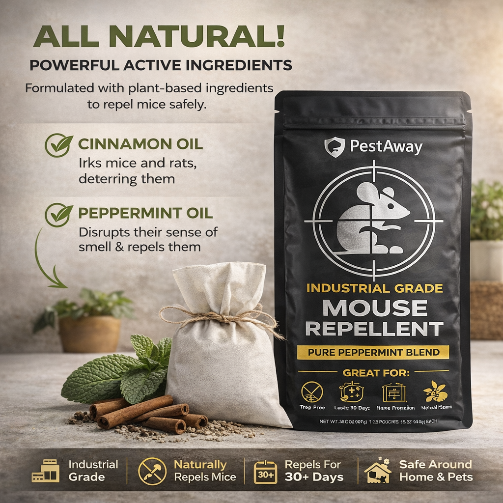 PestAway uses all-natural essential oils and botanicals that pests find unpleasant. When hung, the pouch releases a scent that deters mice, squirrels, rabbits, and moles without harming them.